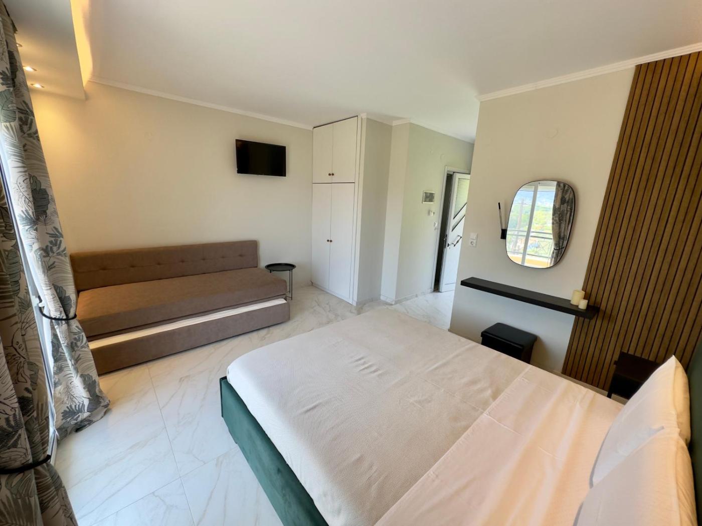 Family Studio. In the fully equipped kitchenette, guests will find a stovetop, a refrigerator, kitchenware and an oven. The studio provides air conditioning, a private entrance, a balcony with sea views as well as a private bathroom featuring a shower. The unit offers 2 beds.