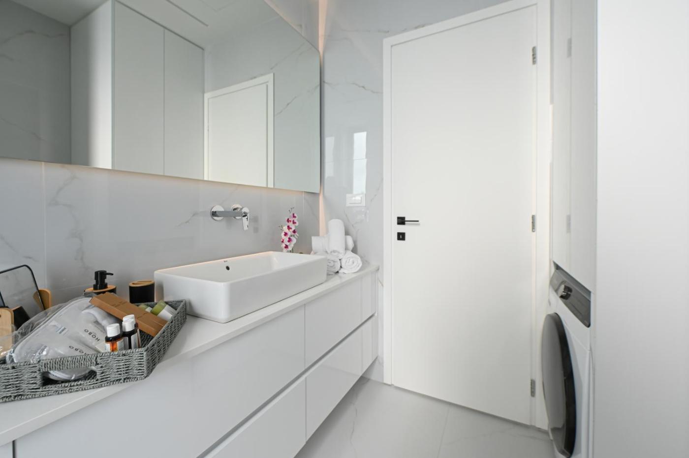 Three-Bedroom Deluxe Apartment. Boasting a private entrance, this spacious apartment also includes 3 separate bedrooms and 2 bathrooms with a shower and a hairdryer. The well-equipped kitchen features a stovetop, a refrigerator, a dishwasher and kitchenware. This apartment has air conditioning, a washing machine, a TV and a balcony. The unit has 3 beds.
