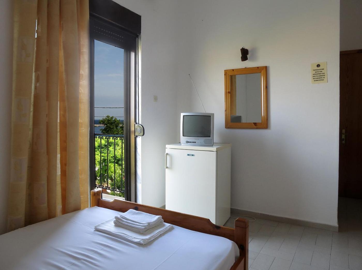 Standard Double Room. This air-conditioned room opens to a balcony enjoying views over the Aegean Sea, the port, the garden and the mountain. It features a TV, a fridge and a private bathroom with shower.