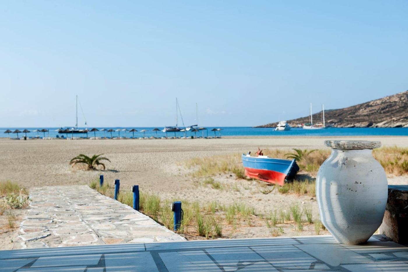 One-Bedroom Apartment. Just 80 metres from the beach, this air-conditioned apartment opens to a balcony or patio with Aegean Sea view. Fitted with iron beds, it includes a TV and fridge. It also comes with a kitchenette and kitchenware.